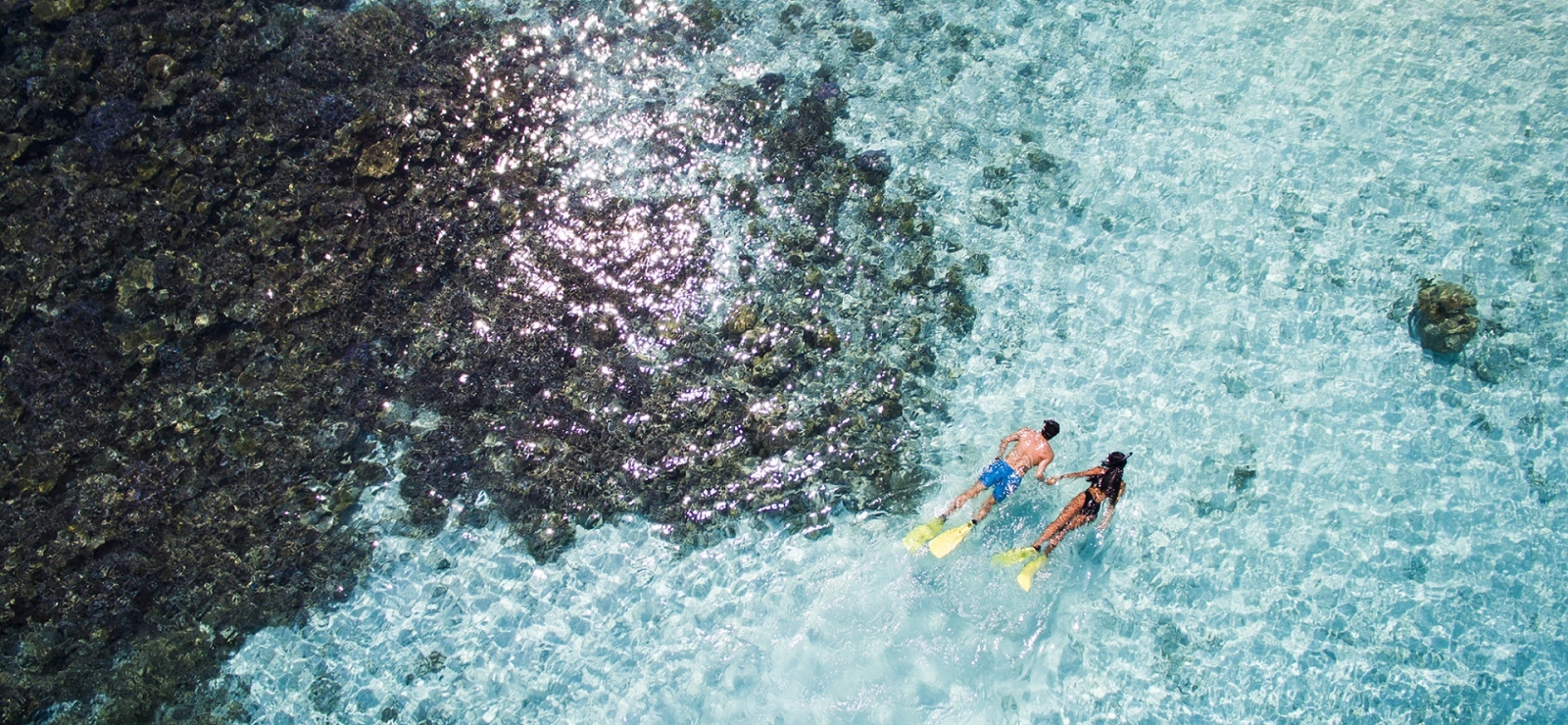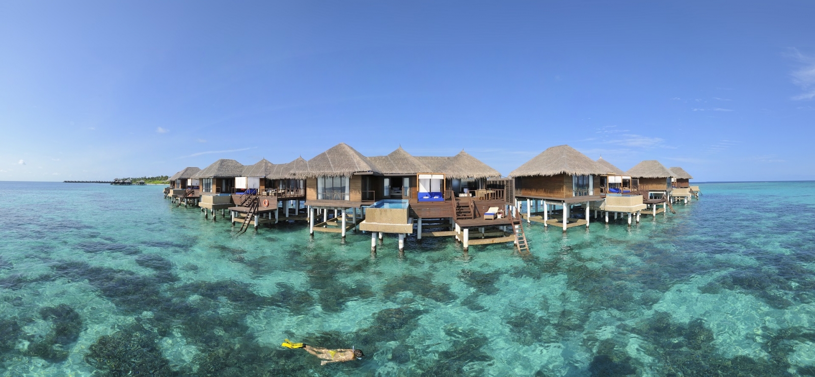Jeżeli wolimy podziwiać bogactwo podwodnego świata bez schodzenia zbyt głęboko, snorkelling na Malediwach to doskonałe rozwiązanie. Odkrywanie magii rafy koralowej można rozpocząć od… wyjścia za próg pokoju. Większość resortów oferuje bowiem nocleg w „wodnych willach”, z których możemy zejść bezpośrednio do ciepłej (30-32 st. Celsjusza) i nierealnie przejrzystej wody.